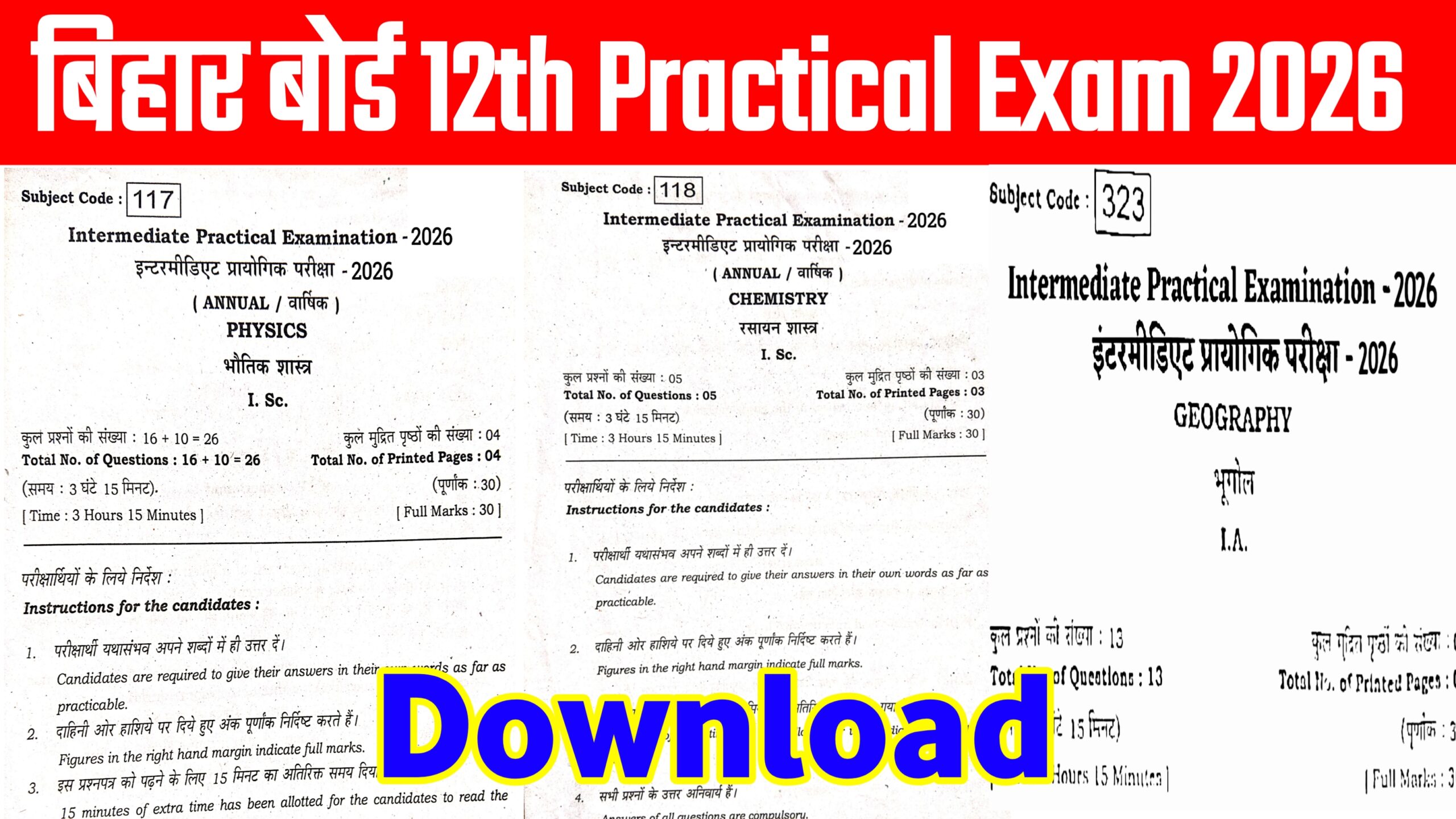 बिहार विद्यालय परीक्षा समिति द्वारा कक्षा 12वीं की प्रायोगिक (Practical) परीक्षा की तिथियाँ घोषित कर दी गई हैं। यदि आप भी 2026 में इंटर की परीक्षा देने वाले हैं, तो यह पोस्ट आपके लिए अत्यंत महत्वपूर्ण है। इस पोस्ट के माध्यम से Bihar Board 12th Practical Question Paper 2026 PDF डाउनलोड कर सकते है