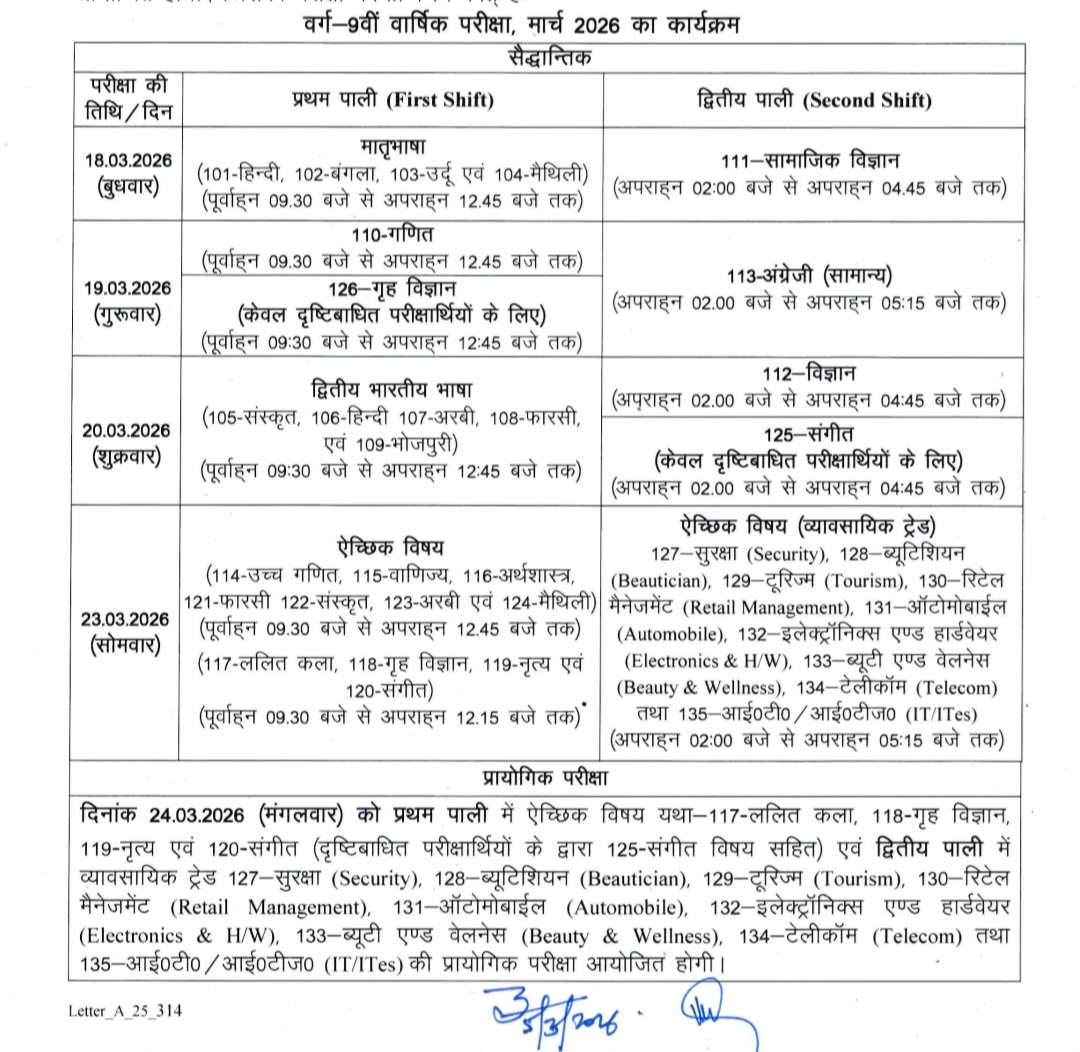 उपर्युक्त विषय के संबंध में कहना है कि कक्षा 11 वीं में अध्ययनरत् विद्यार्थियों के लिए वार्षिक परीक्षा, मार्च, 2026 दिनांक 16.03.2026 से दिनांक 24.03.2026 तक की अवधि में तथा कक्षा 09वीं में अध्ययनरत् विद्यार्थियों के लिए वार्षिक परीक्षा, मार्च, 2026 दिनांक 18.03.2026 से दिनांक 23.03.2026 तक की अवधि में संबंधित शिक्षण संस्थान / विद्यालयों में आयोजित होगी।